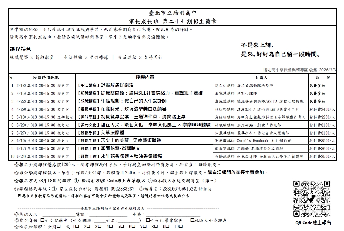 校園公告 公告主旨 【重要】第27期家長成長班 熱烈報名中! 4/22(三)13:30-15:30 【親職講座】 生涯規劃:做自己的人生設計師 盧慕蓉講師 (免費參加) 發佈日期 2026 年 4 月 19 日 發佈單位 輔導組 公告類別 行政公告, 活動快報 公告等級 點閱次數 371 公告內容 相關附件 相關連結 臺北市立陽明高中【家長成長班】第27期報名表單 【2026-04-20】國立陽明交通大學辦理「A3數位素養講師回流研習」,歡迎符合資格 ... 【2026-04-17】115 年「『英語文思辨簡報比賽』研析攻略 3.0 – 『技高辨力店』 ...