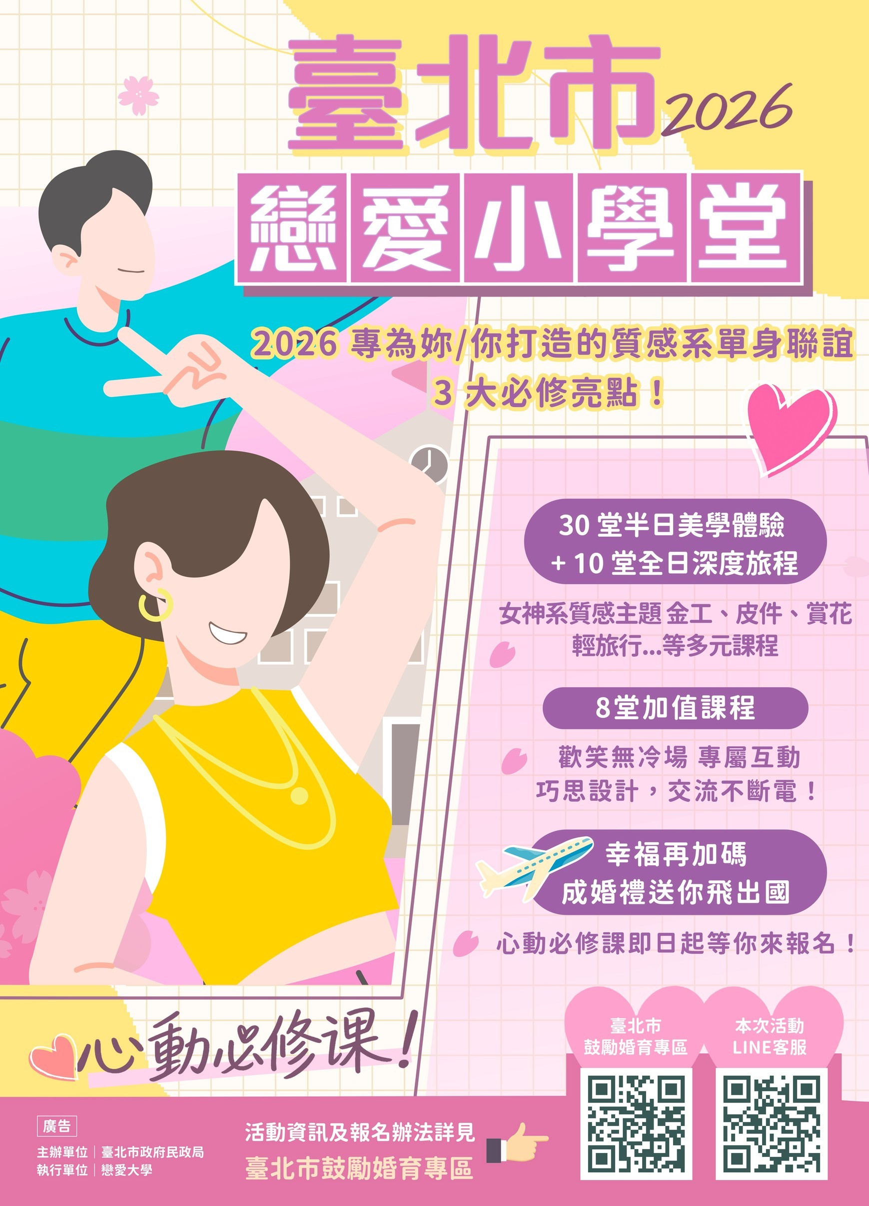 | 公告主旨 | 臺北市政府民政局辦理115年度單身聯誼活動「2026臺北市戀愛小學堂—心動必修課!」,請踴躍參加。 |