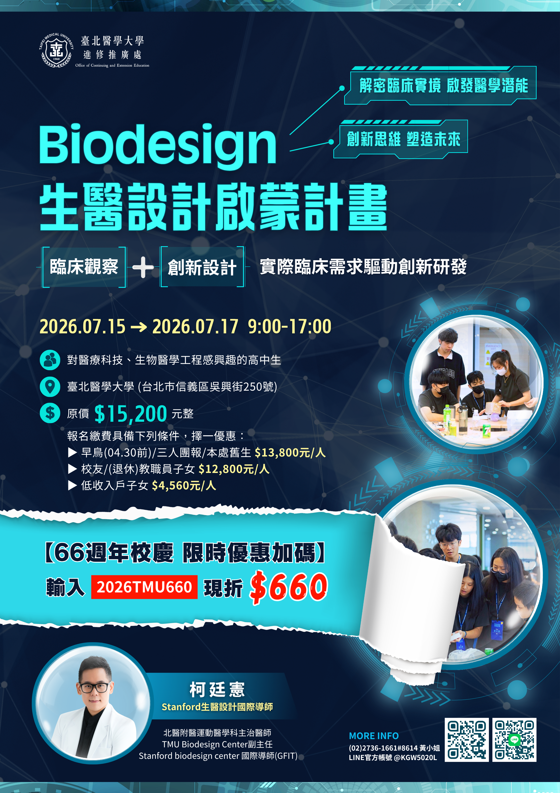 校園公告 公告主旨 臺北醫學大學 Biodesign生醫設計啟蒙計畫 發佈日期 2026 年 4 月 28 日 發佈單位 輔導組 公告類別 營隊資訊 公告等級 轉知 點閱次數 16 公告內容 相關附件 【2026-04-28】轉知國教署115學年度徵聘商借教師辦理科學教育、實驗教育或私立 ...