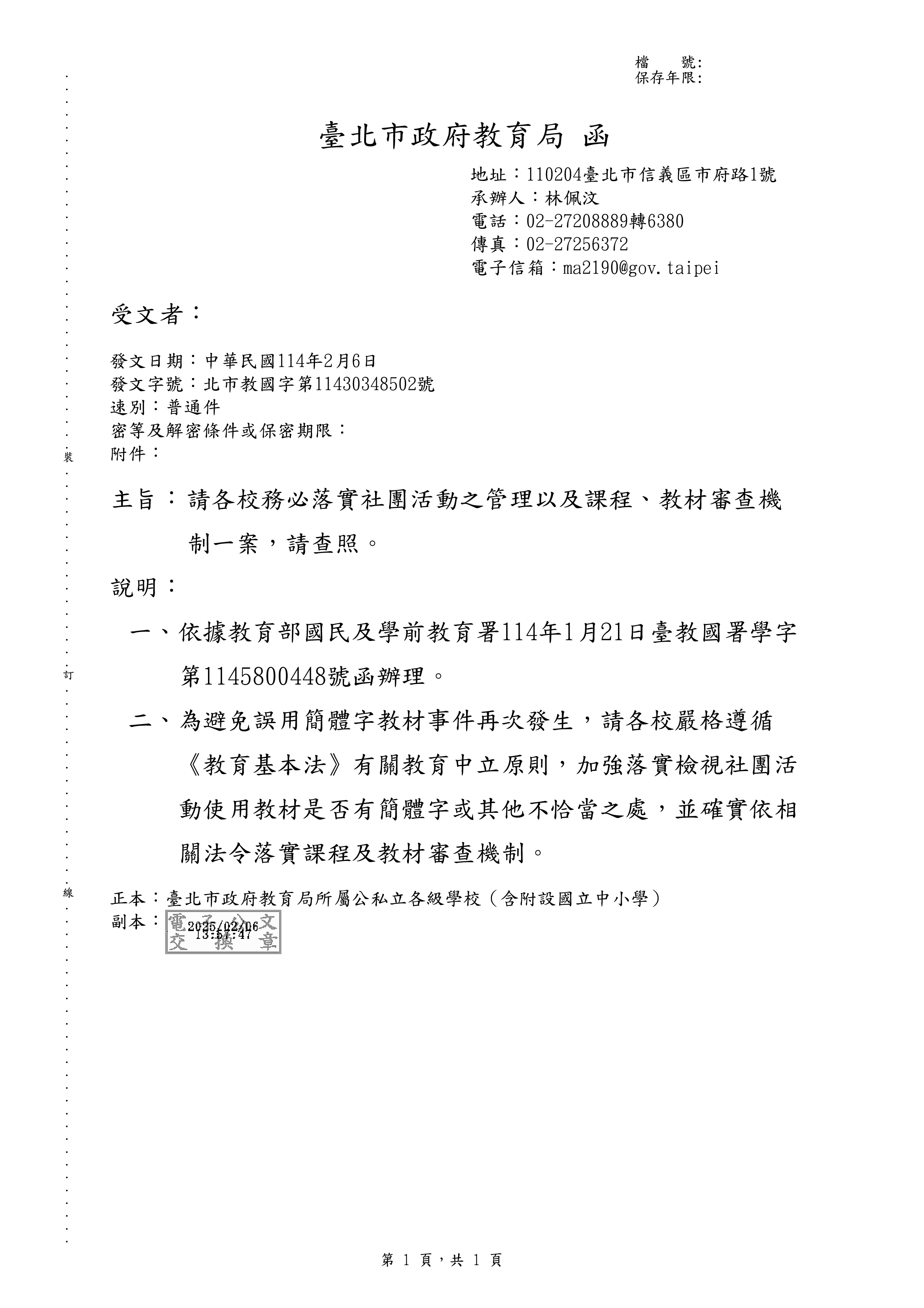 | 公告內容 | 以免誤用簡體字教材情事再發生,請遵循《教育基本法》有關教育中立原則,加強落實檢視社團活動使用教材是否有簡體字或其他不恰當之處,並確實依相關法令落實課程及教材審查機制。 |