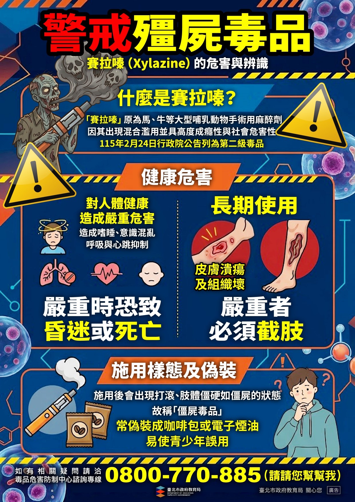 | 公告內容 | 一、依行政院115年2月24日正式公告,將賽拉嗪(Xylazine)列為第二級毒品(行政院公報:https://gazette.nat.gov.tw/egFront/eguploadpubWrapper?metaid=163724&file=/EG_FileManager/eguploadpub/eg032031/ch01/type1/gov01/num1/Eg.htm)。 二、「賽拉嗪(Xylazine)」原為獸醫使用之麻醉藥物,近年遭濫用並常與其他毒品混合使用,施用後會出現打滾、肢體僵硬如僵屍的狀態, 故稱「僵屍毒品」。 三、該毒品對人體危害極大。施用後可能出現步履蹣跚、呼吸困難、方向感喪失等症狀,並伴隨視線模糊、過度嗜睡,甚至昏迷等副作用;亦可能導致皮膚潰瘍,嚴重者需截肢。若與其他毒品混合使用,死亡風險更高。此外,此類毒品常偽裝成咖啡包或電子煙油等產品,增加青少年誤用的風險。