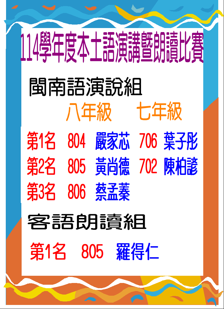 校園公告 公告主旨 114學年度本土語演講暨朗讀比賽得獎名單 發佈日期 2026 年 4 月 22 日 發佈單位 教務組 公告類別 榮譽榜 公告等級 賀 點閱次數 28 公告內容 相關附件 【2026-04-22】國中部。【第二次段考】考程表