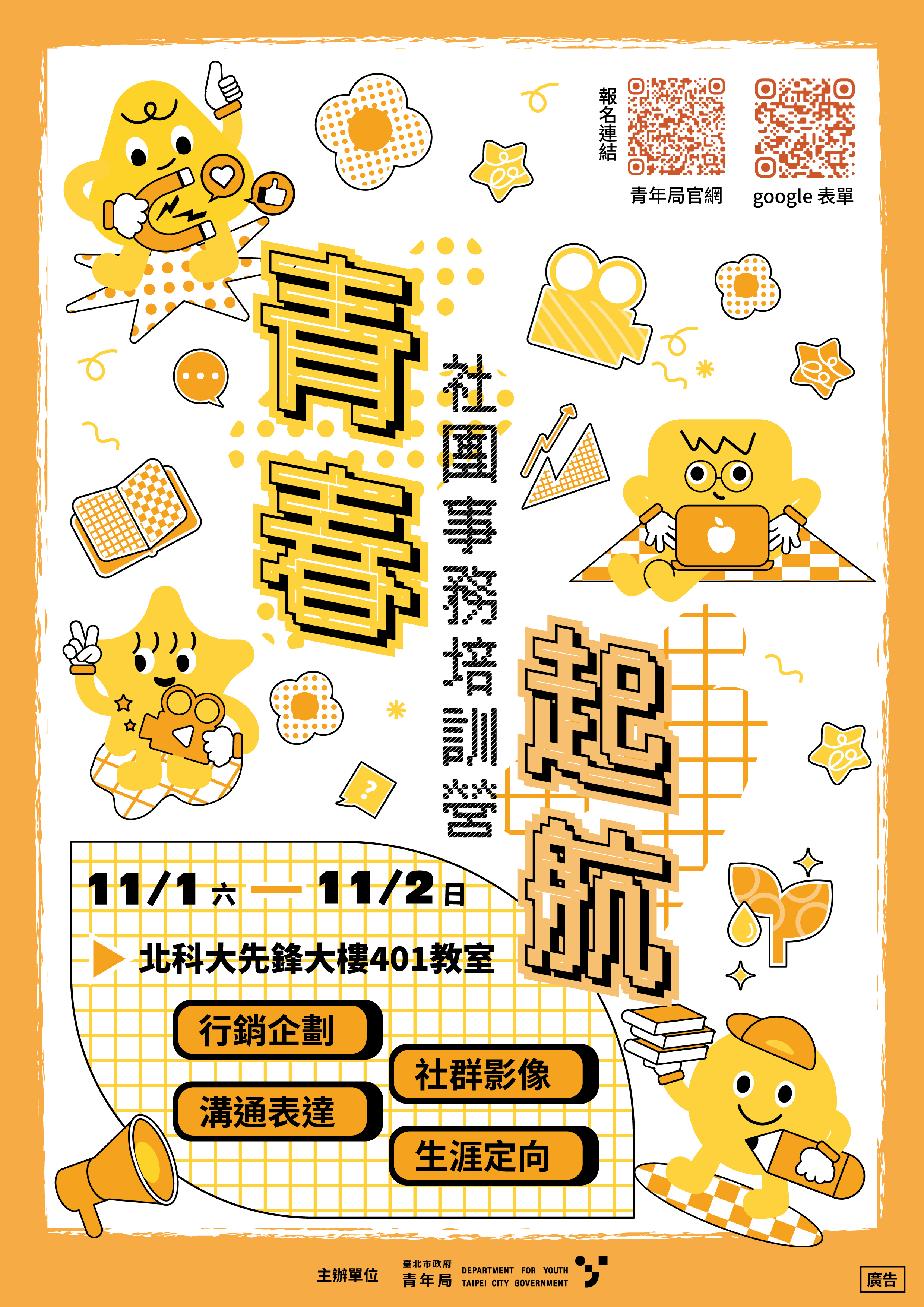 公告內容 | 一、活動宗旨:為鼓勵本市在學青年積極參與學生社團活動,培養「企劃行銷」、「社群影像」、「溝通表達」、「生涯定向」等能力,邀請專業講師進行講授,透過經驗分享與實作演練,培養策略思考能力。 |