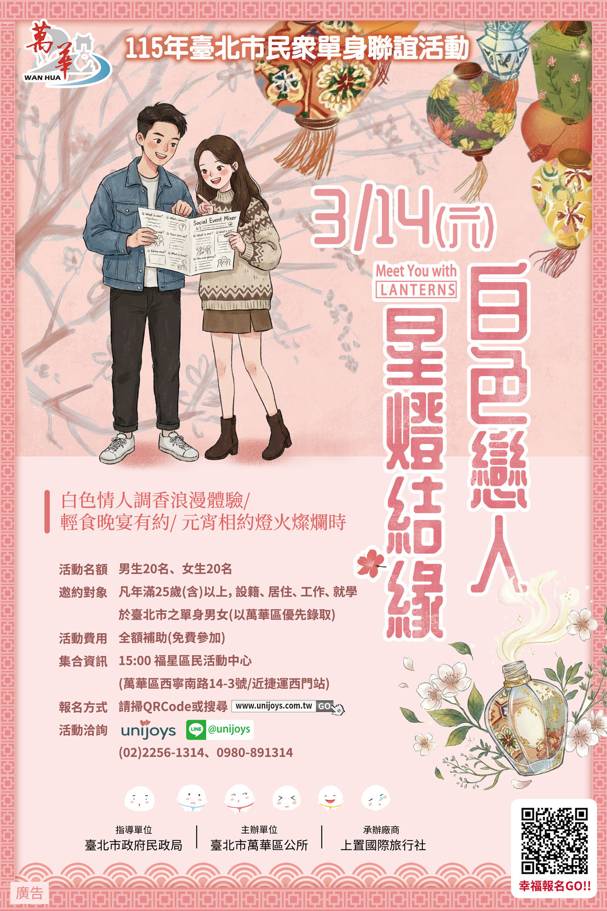 | 公告內容 | 臺北市萬華區公所115年度單身聯誼活動「白色戀人星燈結緣」,將於115年3月14日15時至21時於西門町周邊舉辦,線上報名時間自1月19日起至114年2月27日或額滿為止,凡年滿25歲以上,在臺北市居住、工作或就學,並且有穩定工作者(以萬華區者優先錄取),總計40個名額,男女各20人, 免費參加, 活動洽詢( 02) 2256-1314、0980-891-314洪小姐或至網站(https://www.unijoys.com.tw/activity/20260314白色戀人星燈結緣)瀏覽查詢。 其他詳情請參閱附檔。 |