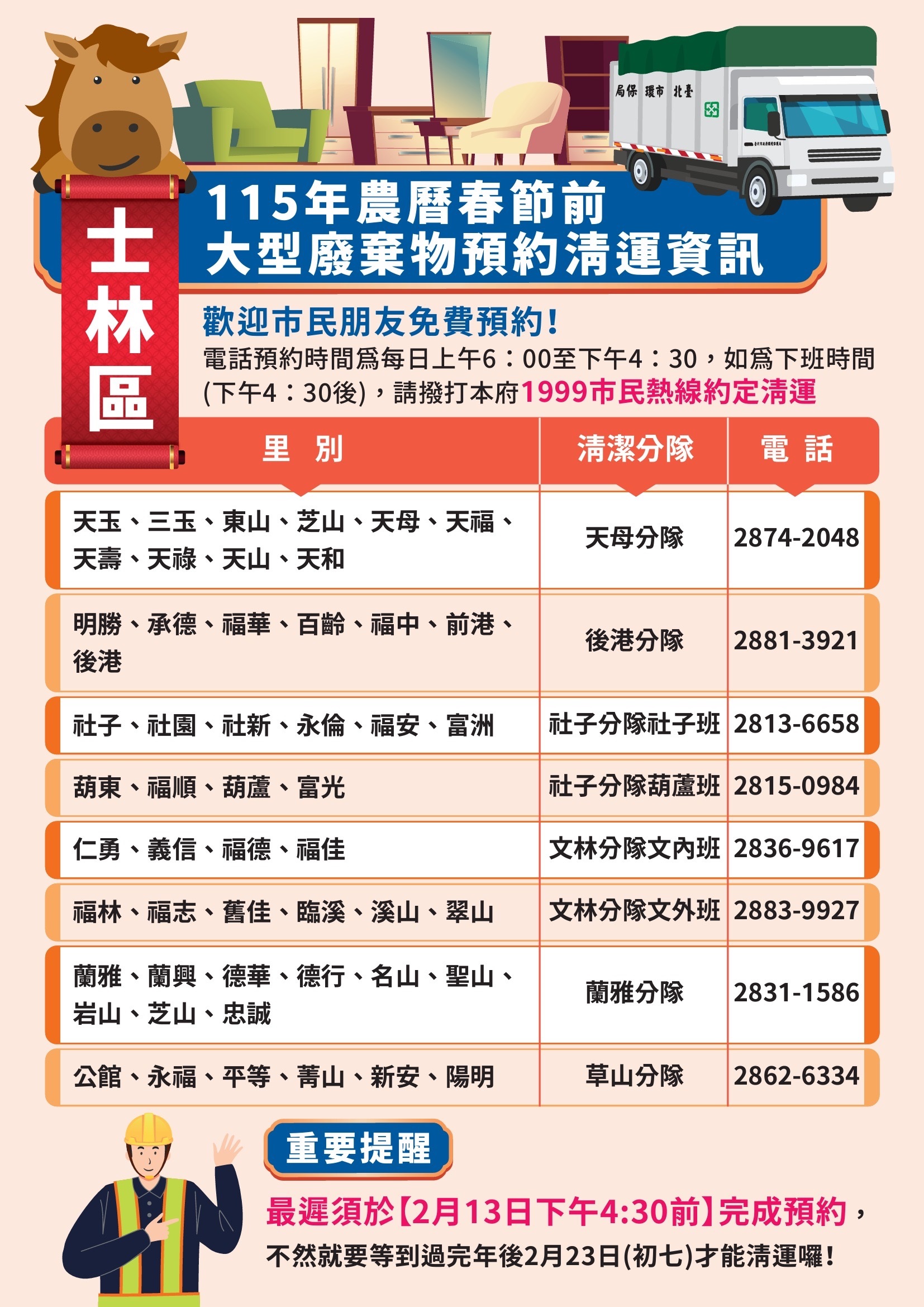 校園公告 公告主旨 115年年終大掃除暨春節期間垃圾清運方式 發佈日期 2026 年 1 月 15 日 發佈單位 衛生組 公告類別 行政公告 公告等級 轉知 點閱次數 132 公告內容 臺北市春節假期垃圾收運方式: 小年夜、除夕、初四加收垃圾 初一至初三、初六停收垃圾, 停收期間可至本市限時收受點排出垃圾,詳情請上臺北市環保局網站查詢。 相關附件 【2026-01-15】國立臺灣科技大學辦理115學年度申請入學及如何準備學習歷程檔案 ... 【2026-01-15】「HIV戶外實境解謎計畫」問卷調查