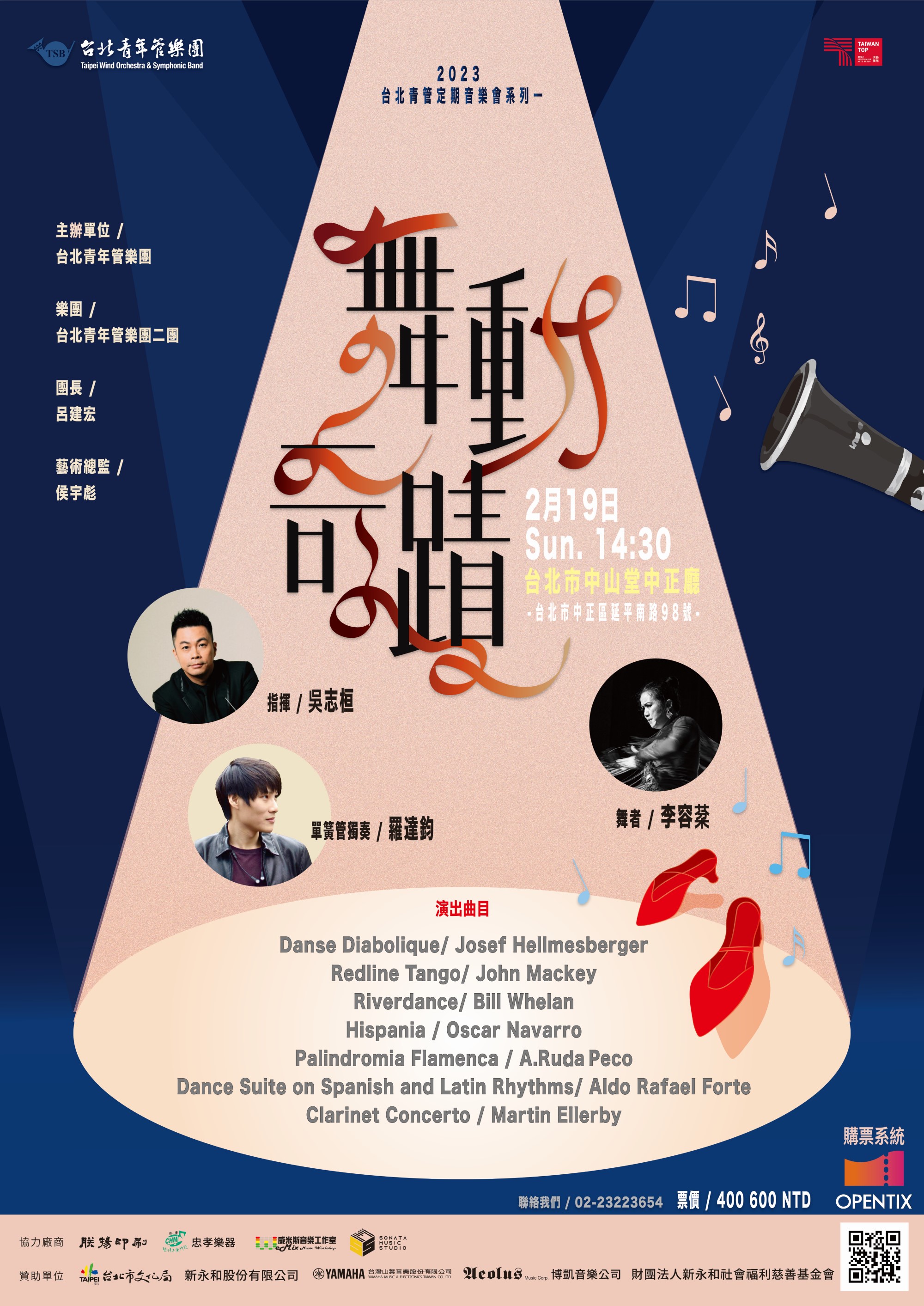 校園公告 公告主旨 2023台北青管定期音樂會系列一《舞動奇蹟》 發佈日期 2023 年 1 月 16 日 發佈單位 學務處 公告類別 活動快報 公告等級 轉知 點閱次數 356 公告內容 音樂會相關訊息如下: (一)演出時間:112年2月19日 (星期日)下午2:30 。 (二)演出地點:臺北市中山堂中正廳(臺北市延平南路98號)。 (三)購票與折扣優惠查詢 請至兩廳院購票系統 (https://0rz.tw/oc4At);相關問題請逕洽台北青管樂團經理王先生(02-2322-3654)。 (四)相關音樂會資訊請至台北青年管樂團臉書粉絲專頁查詢 (https://www.facebook.com/tsbgroup/)。 相關附件 【2023-01-16】臺灣新文化運動紀念館「日治生存大作戰」活動開放申請 【2023-01-16】111學年度下學期台北青管附屬團隊招生